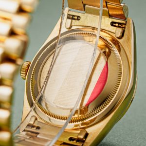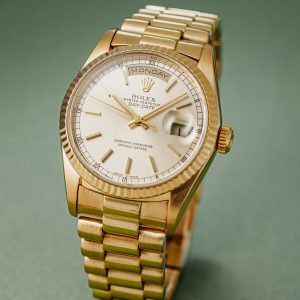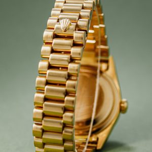 The 36 mm case is a model of classic perfection, a size that has remained the definition of luxury throughout the years. The champagne-colored dial acts as the soft heart, providing a serene background for the Day and Date indicators, which present the days of the week and the date impeccably. The famous Presidential bracelet embraces the wrist with a fluid grace, each link a miniature work of art. The bracelet is not merely an accessory, but an extension of the case’s golden glory.