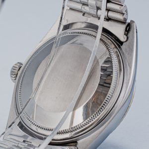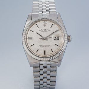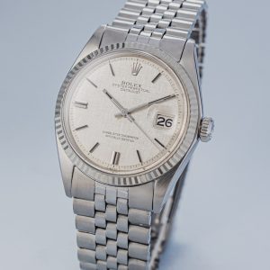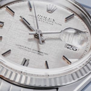 In the world of vintage Rolex Datejusts, it’s the subtle details that set a piece apart. This reference 1601 features a beautifully textured linen dial with black hour markers clean, sharp, and understated. It’s all framed by the iconic white gold fluted bezel, adding a touch of refined brilliance without being overbearing. Of course, it’s fitted on the classic Jubilee bracelet, completing the timeless Datejust profile.